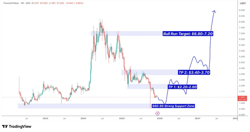 Toncoin (TON) is a high-performance Layer-1 blockchain originally conceived by the Telegram team and now maintained by the community-led TON Foundation. Its primary growth driver is its deep, native integration within the Telegram messaging app, providing access to nearly a billion users. The network utilizes “sharding” technology to handle millions of transactions per second, making it highly scalable for decentralized apps (dApps) and payments. As the ecosystem matures with increased institutional funding and DeFi innovations, Toncoin is positioned for significant adoption, though its performance remains closely tied to Telegram’s regulatory landscape.