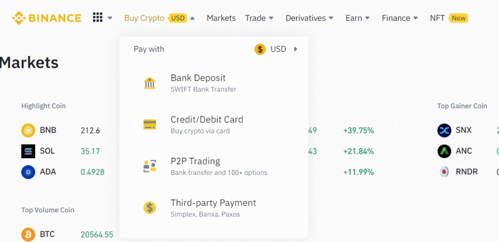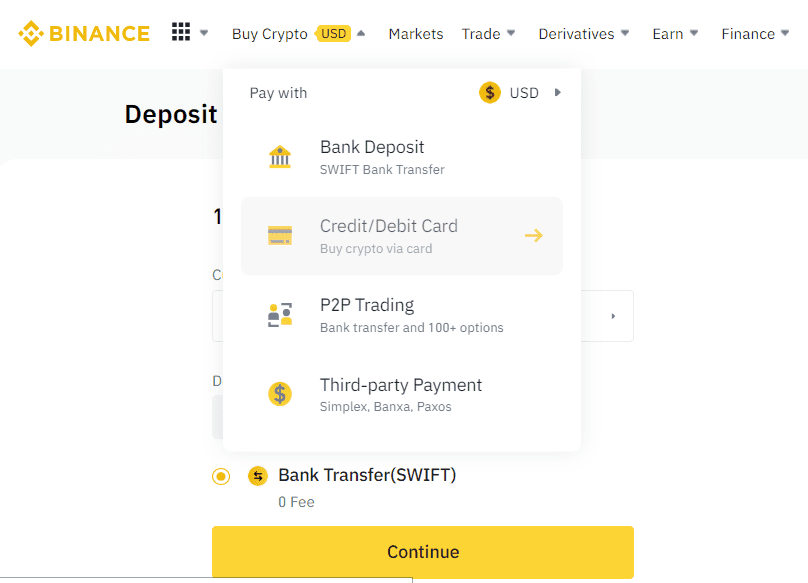 First, go to the Binance website. On the homepage, click the Buy Crypto button on the top navigation bar, then select Bank Deposit. A new page will open where you can choose the currency and amount you want to deposit.